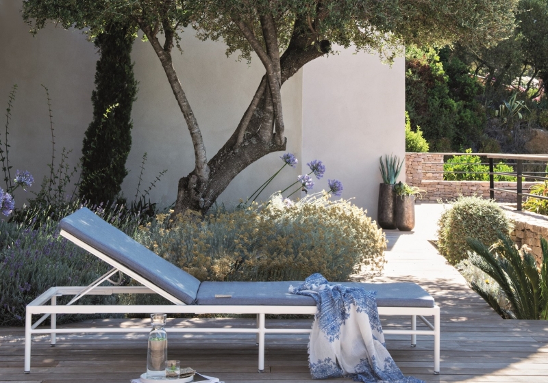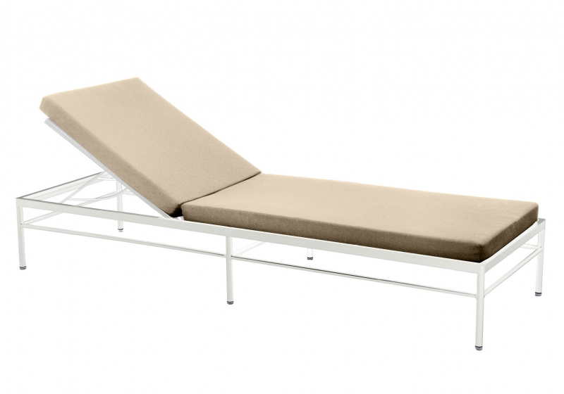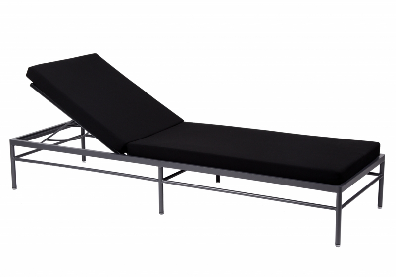 Matelas en mousse polyuréthane 75 mm d’épaisseur inclus HR 30 kg/m3 et grille antidérapante. Habillage toile teint masse 100% acrylique, qualité natté de Sunbrella®, ou Batyline® Eden (tissu outdoor déperlant, traité antitâche).