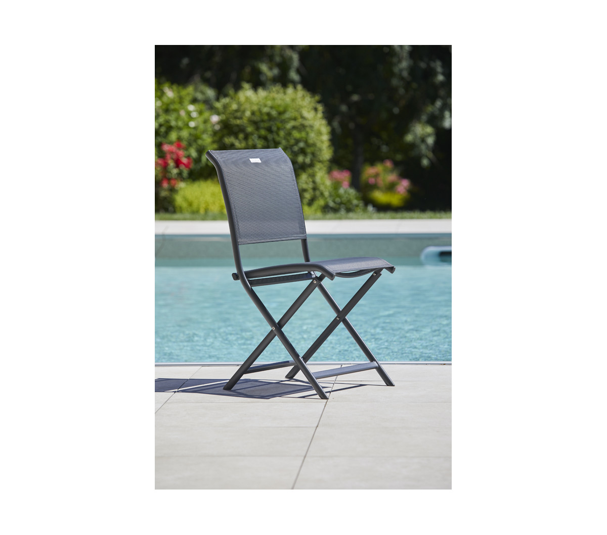 Chaise LIZA, structure aluminium anthracite et assise polyester PVC.