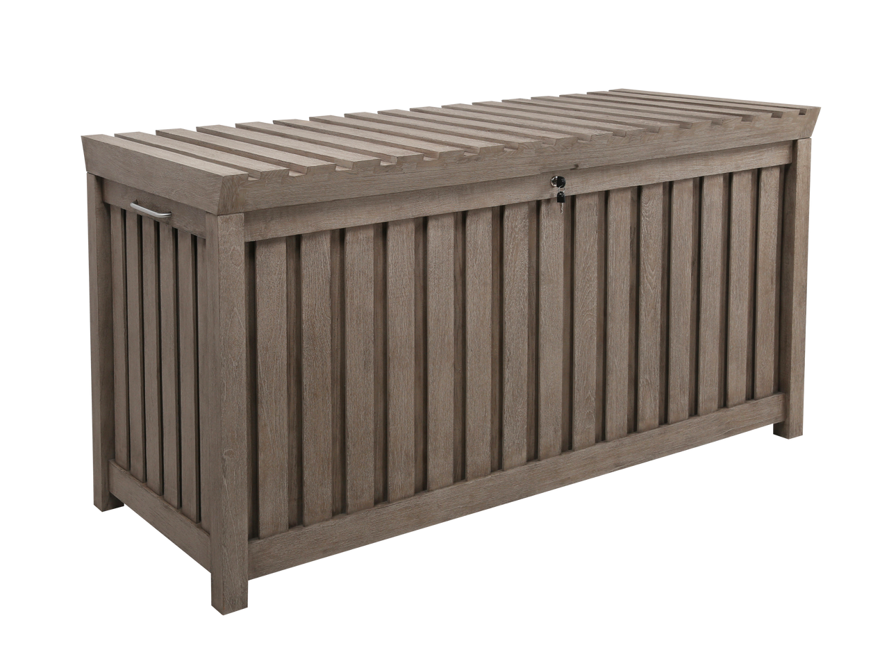 Coffre de rangement SKAAL en teck Duratek. Ce coffre étanche permet d’y stocker entre autres, les coussins des bains de soleil sans que ceux-ci ne craignent la pluie.