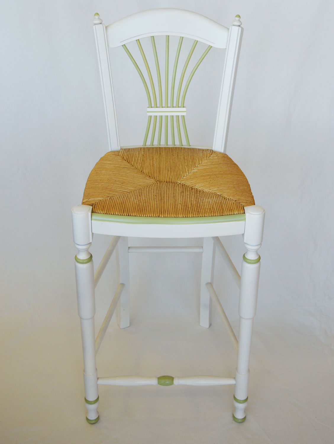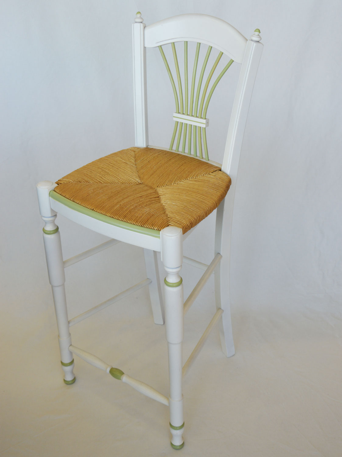 Tabouret snack avec une structure en hêtre blanc rechampie et une assise en paille de seigle vert.