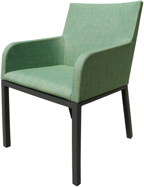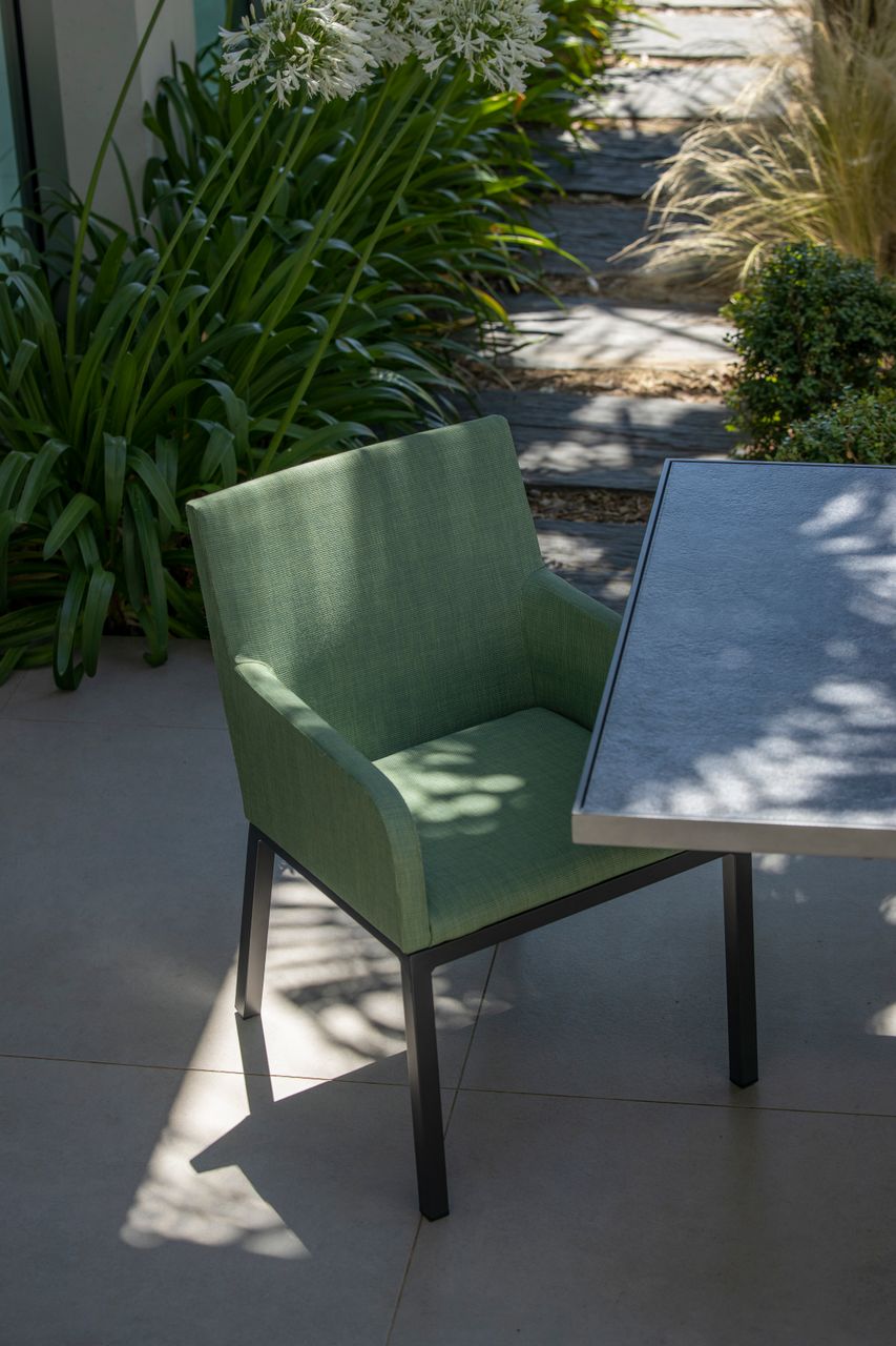 Fauteuil de repas AMAKA avec une structure en aluminium recouverte de toile Olefin sur son intégralité. La toile est la mousse qui compose l’assise sont à séchage rapide, grâce à cela le fauteuil peut rester dehors toute l’année.