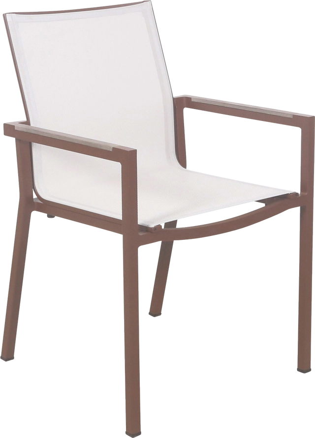 Fauteuils empilables AMAKA. Confortables, pratiques, légers ces assises peuvent s’adapter à toutes les tables de la collection AMAKA, mais plus généralement à n’importe quelle table Les Jardins. Des patins d’empilabilité permettent de ne pas abimer la structure lorsqu’on les empile. De plus la toile est thermosoudée à la structure ce qui lui confère une tenue dans le temps optimale.