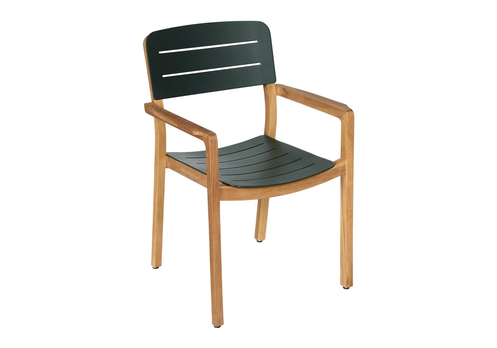 Fauteuil empilable LODGE, structure teck massif, finition naturelle (non huilé) ou aluminium vert