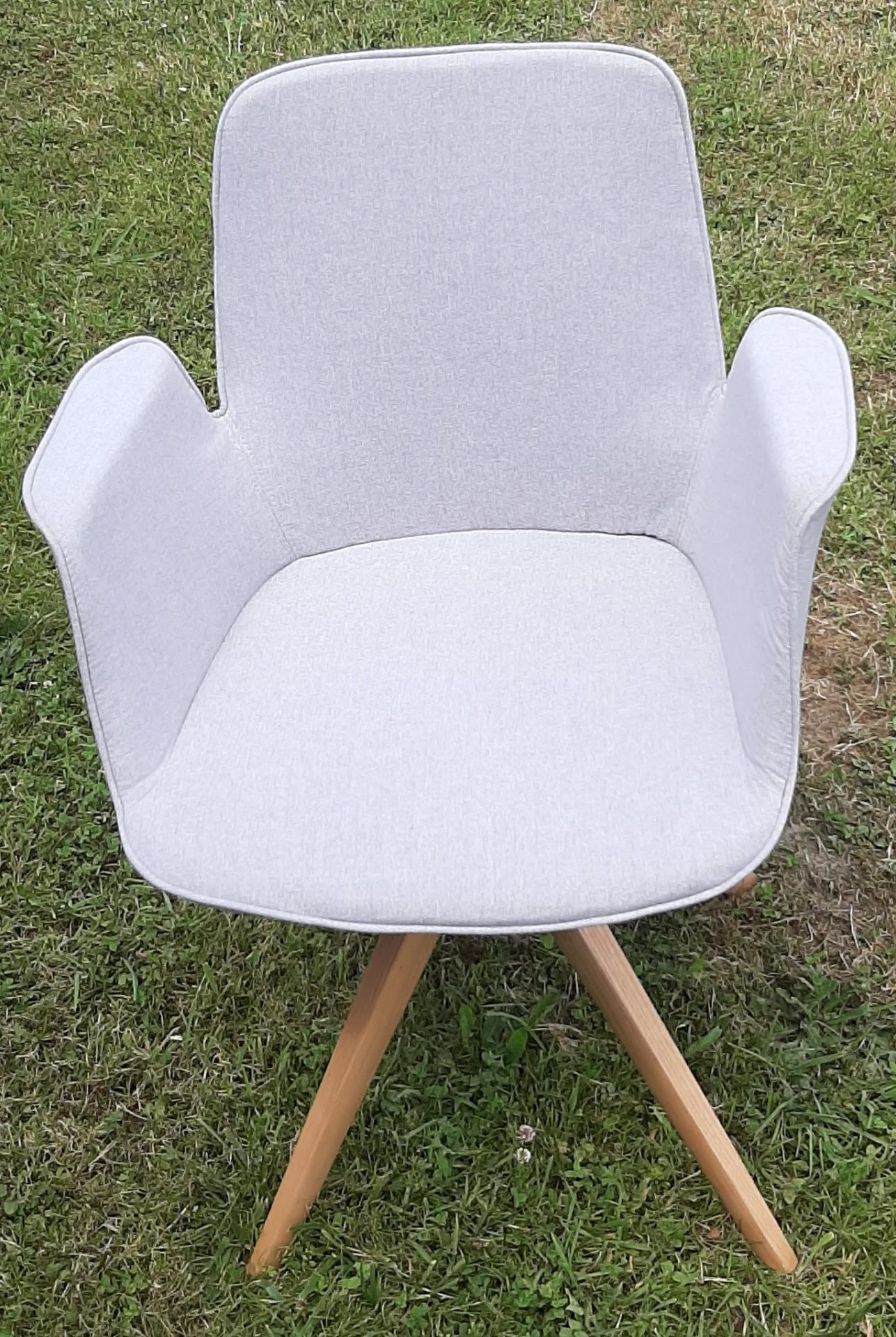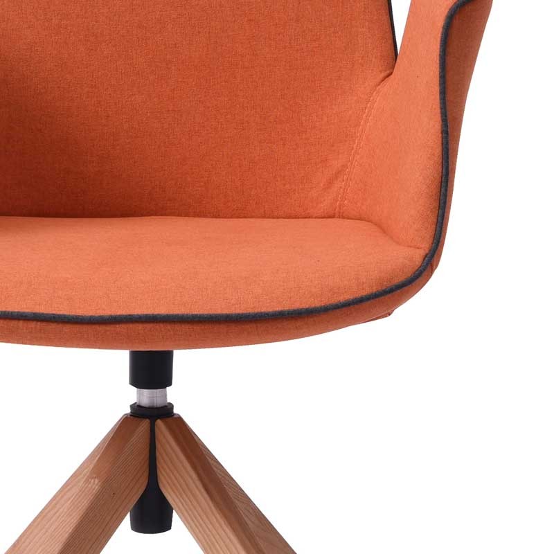 Piétement pivotant avec retour automatique en hêtre massif plaqué chêne et métal laqué époxy noir, assise et dossier en tissus sur mousse densité 26kg/m².