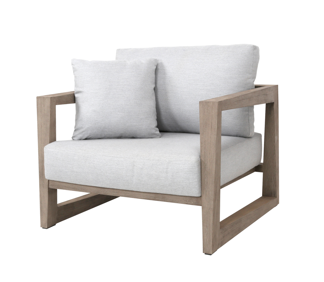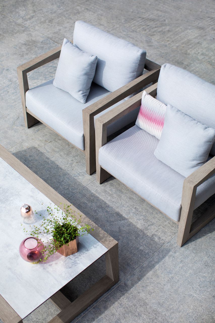 Fauteuil lounge SKAAL small en teck finition Duratek® et coussins en Sunbrella Natte gris clair. Fauteuil très confortable ici dans sa version « small » pour agencer les espaces plus petits. Ici, les profils asymétriques du teck Duratek® prennent toute leur importance et donnent au fauteuil SKAAL toute sa personnalité.