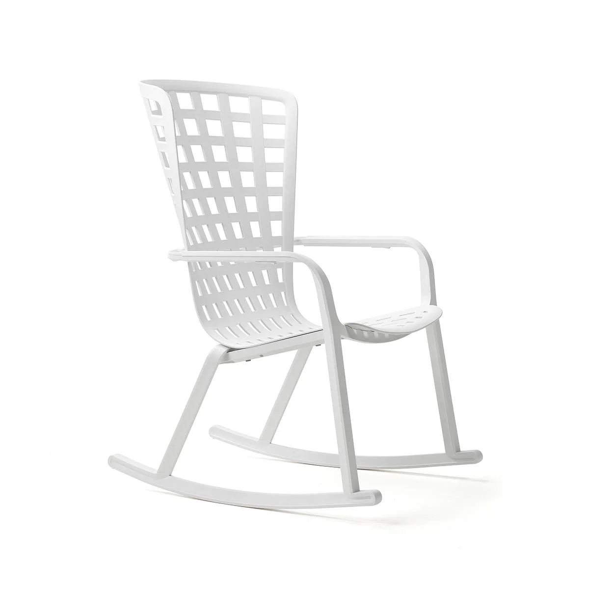 Folio Rocking est un fauteuil de relaxation à bascule stylisé d’extérieur, fabriqué en résine fibre de verre ajourée d’un motif à carrés et à finition mate.