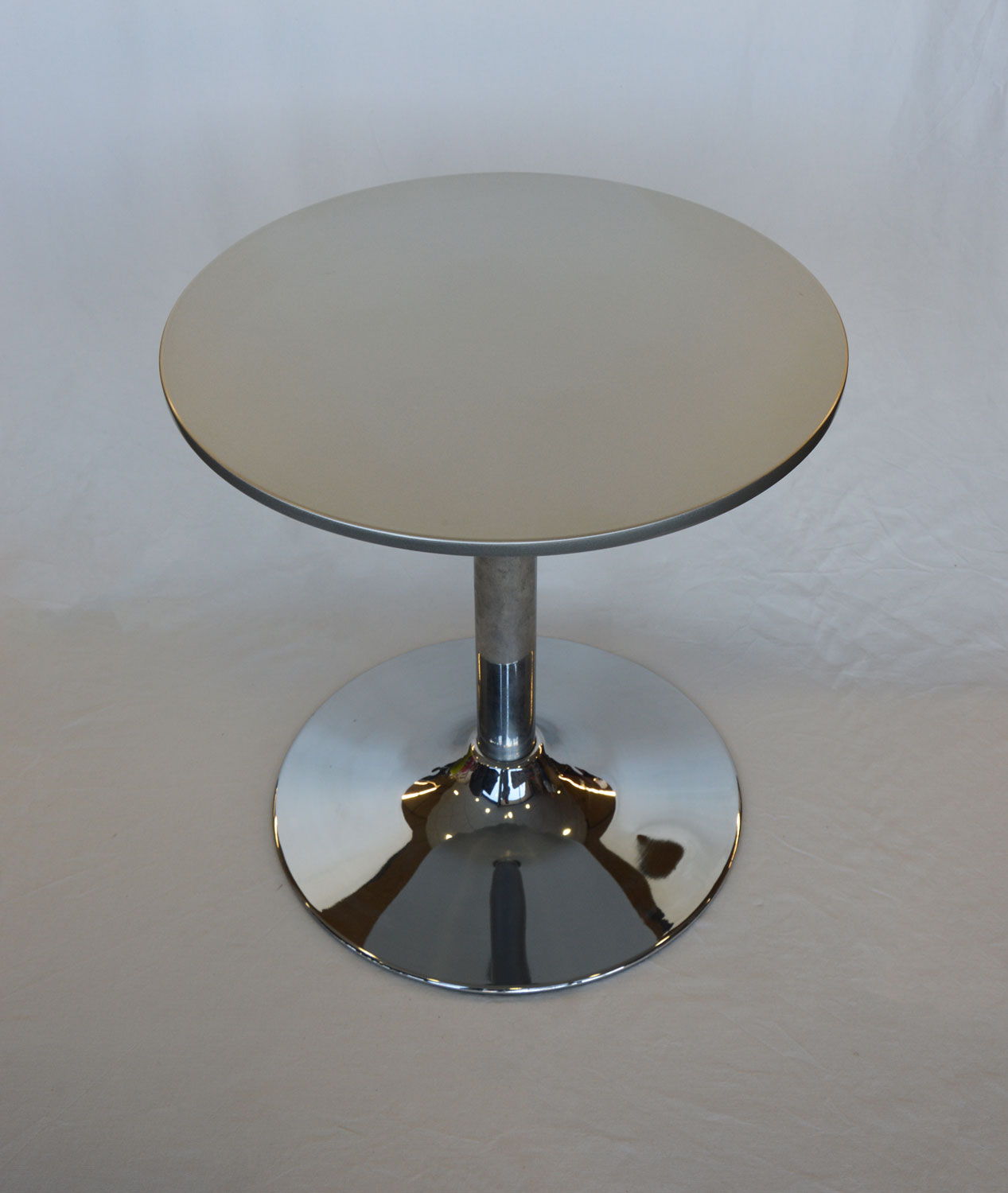 Pied central chromé et plateau en résine gris aluminium.