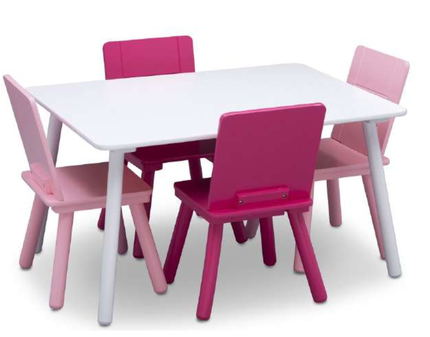 Table grise et quatre chaises camaïeu de rose delta ( deux chaises ton rose clair et deux chaises fuchsia).