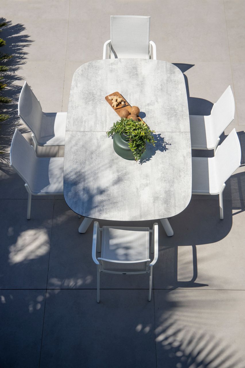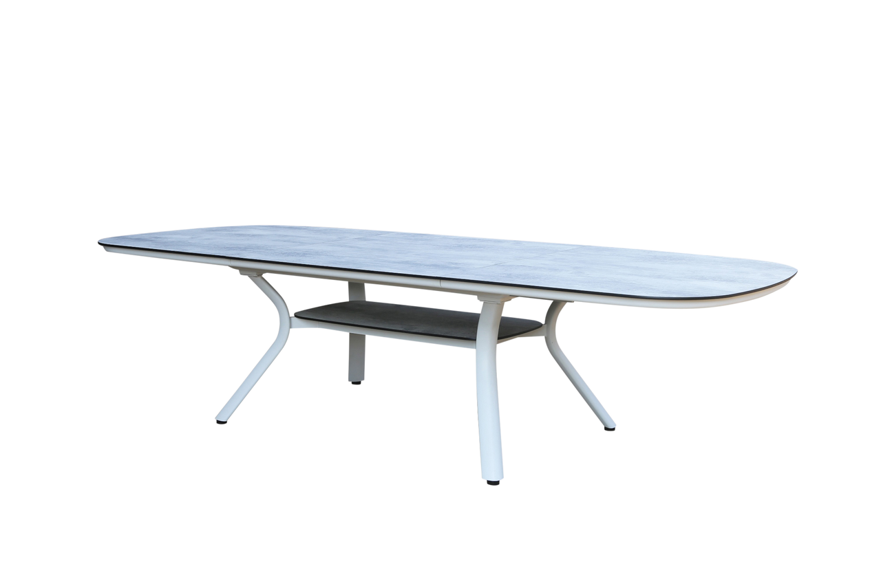 Structure en aluminium avec 2 coloris blanc ou gris avec un plateau HPL finition béton ciré.