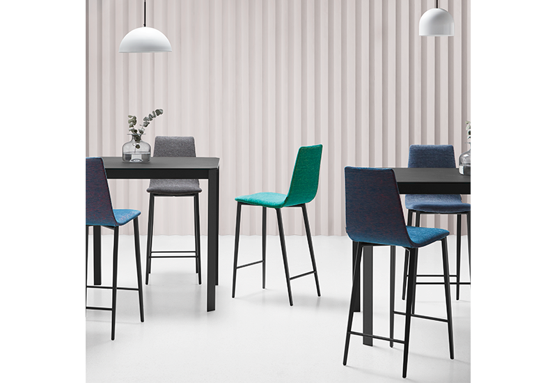 La collection Salt se compose d’une table fixe et une autre extensible avec deux hauteurs possibles et d’une table basse d’une hauteur de 40cm. Les modèles de cette collection offrent des dimensions modérées afin de pouvoir obtenir de la place dans un espace réduit, étant son principal atout. Le plateau est en céramique laminée sur du verre et s’associe facilement aux pieds triangulaires grâce aux formes qui lui sont concédés sur les chants. En plus des tables, la collection Salt se compose d’une chaise et d’un tabouret avec différentes assises qui accordent une totale diversité à la collection. Une solution en bois et deux autres en tissu, assemblé à une structure métallique et de forme triangulaire.